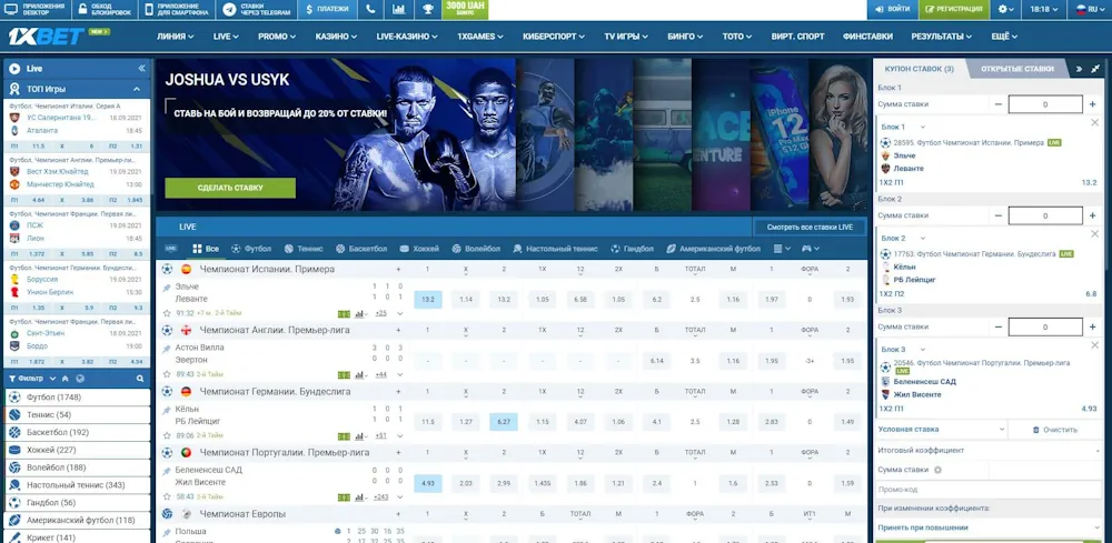 Официальный сайт 1xBet выполнен в фирменной гамме платформы — синем и белом цвете. Интерфейс выдержанный, лёгкий для восприятия, а отсутствие чрезмерных рекламных баннеров позволяет сосредоточиться на главных разделах. Верхнее меню сайта предоставляет мгновенный доступ к ключевым категориям: