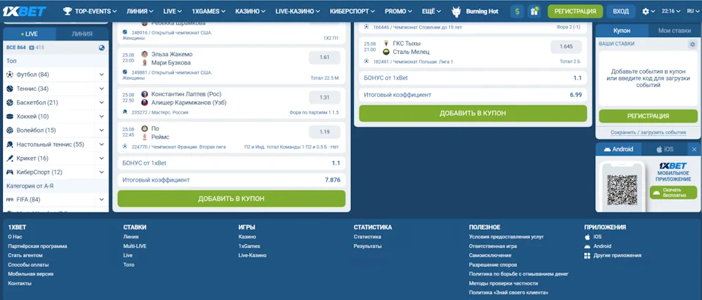 Для оформления ставки необходимо выбрать мероприятие из линии или Live-раздела, нажать на коэффициент предполагаемого исхода и добавить событие в купон. Затем остаётся указать сумму, подтвердить решение и дождаться завершения события. Игрок может варьировать ставки, выбирать одиночные исходы или составлять экспрессы, комбинируя несколько результатов в одном купоне.